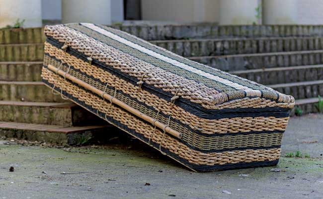 Uitvaartmanden van natuurlijke materialen zoals wilgenteen, pandanus en bananenblad. Geschikt voor natuurbegraafplaatsen, crematie en reguliere begrafenissen.