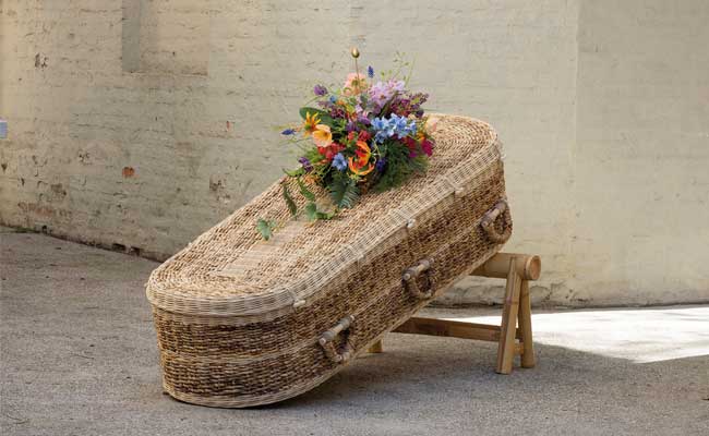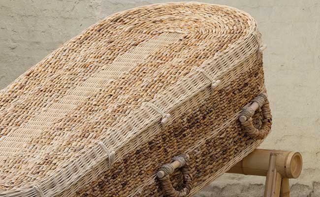 Uitvaartmanden van natuurlijke materialen zoals wilgenteen, pandanus en bananenblad. Geschikt voor natuurbegraafplaatsen, crematie en reguliere begrafenissen.