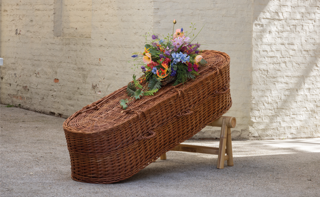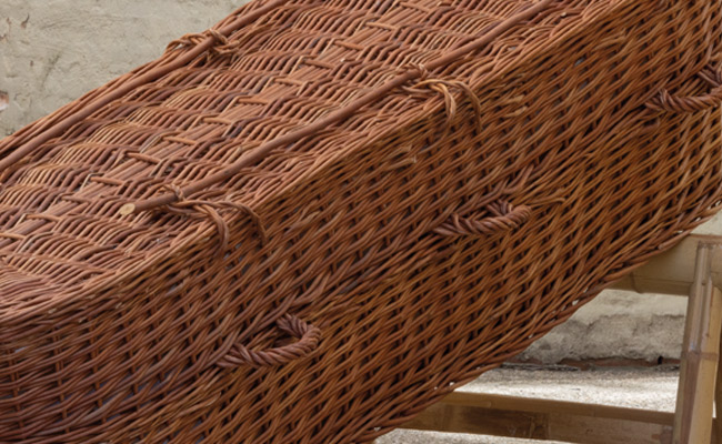 Uitvaartmanden van natuurlijke materialen zoals wilgenteen, pandanus en bananenblad. Geschikt voor natuurbegraafplaatsen, crematie en reguliere begrafenissen.