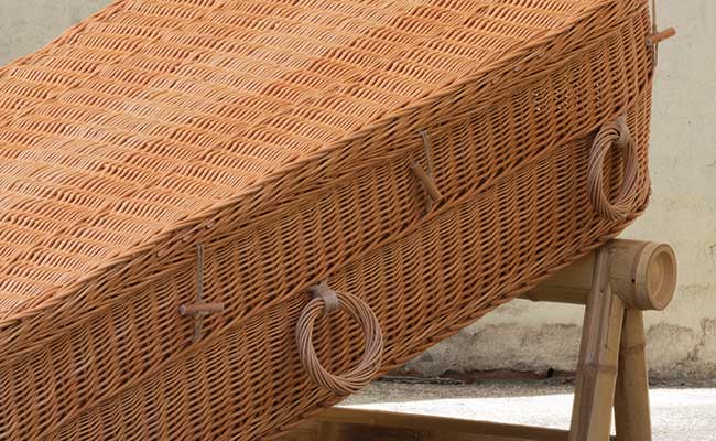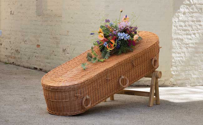Uitvaartmanden van natuurlijke materialen zoals wilgenteen, pandanus en bananenblad. Geschikt voor natuurbegraafplaatsen, crematie en reguliere begrafenissen.