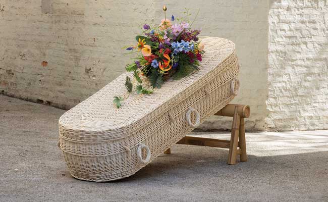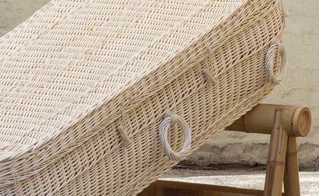 Uitvaartmanden van natuurlijke materialen zoals wilgenteen, pandanus en bananenblad. Geschikt voor natuurbegraafplaatsen, crematie en reguliere begrafenissen.