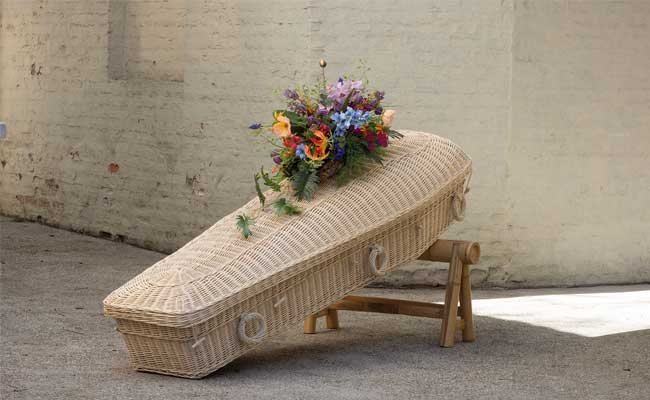 Uitvaartmanden van natuurlijke materialen zoals wilgenteen, pandanus en bananenblad. Geschikt voor natuurbegraafplaatsen, crematie en reguliere begrafenissen.