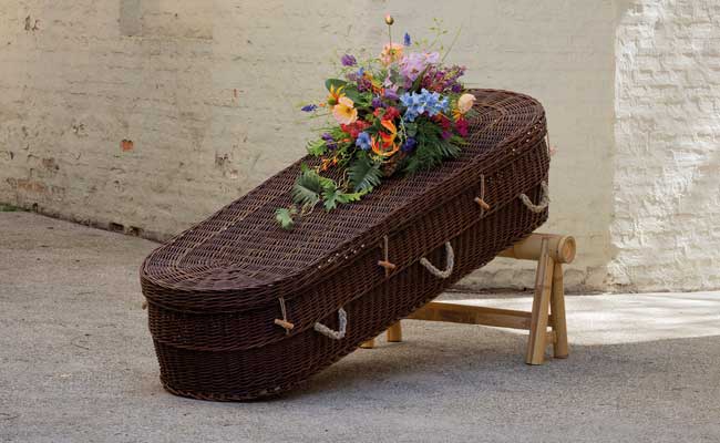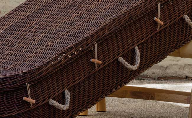 Uitvaartmanden van natuurlijke materialen zoals wilgenteen, pandanus en bananenblad. Geschikt voor natuurbegraafplaatsen, crematie en reguliere begrafenissen.