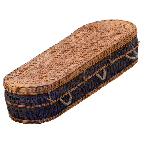 De Willem is een wilgentenen uitvaartmand met blauwe zijkanten, bruine accenten en deksel voor een rustige uitstraling. Ronde vorm met grijze touwhandgrepen. De deksel is stoffen bekleed. Houten bodem en hoogwaardige vlechttechniek zorgen voor draagkracht tot 160 kg. Geschikt voor crematorium en natuurbegraafplaats.